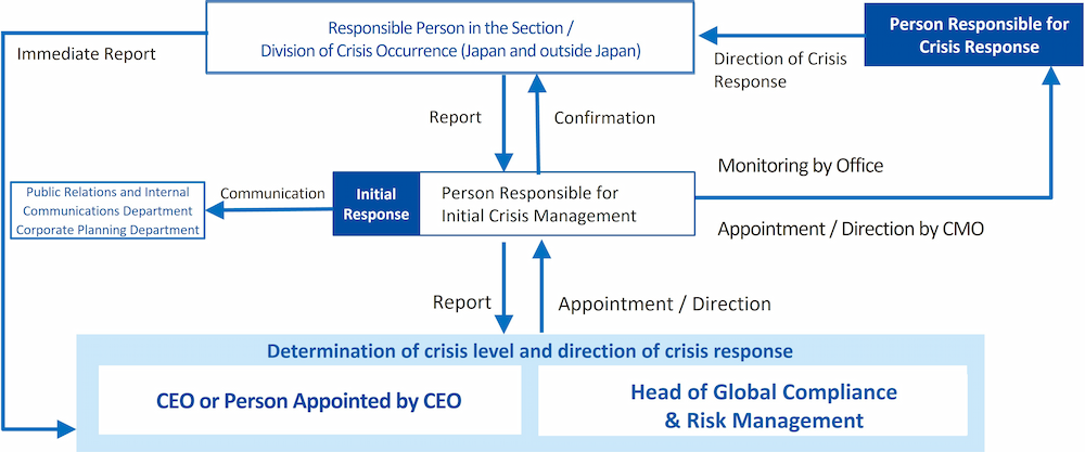 In addition to promoting autonomous Crisis Management in each region and function as well as at group companies, we have established a process that enables us to respond flexibly and globally according to the type of Crisis (Disasters, Accidents, Incidents (including Terrorism), Scandals, Violations of laws, Information management issues, Product issues) and the degree of impact of the Crisis.