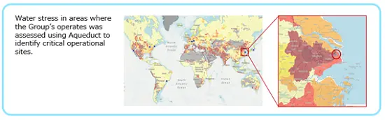 We conducted a location-based analysis* on nature-related issues in three areas —water resources, pollution, and ecosystems—using risk assessment tools, to evaluate the likelihood of physical risk materialization across our business regions, focusing on risks that are both measurable using assessment tools and of a certain level of materiality. As a result, eight of the Group’s direct operational sites were identified as our critical bases. For the upstream portion of the value chain, risk analyses were conducted on five key raw materials at their main production sites and locations with potential nature-related issues were identified for all of these raw materials.