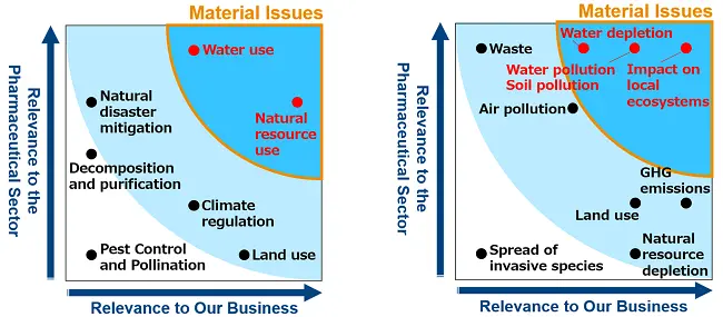 In FY2024, we developed a materiality map of nature-related challenges from the perspectives of the depth of connection with the pharmaceutical sector and our business activities, and identified material issues related to its dependencies on and impacts on nature across relevant sectors. In FY 2025, we assessed the materiality of nature-related risks with potential future impacts on its business by conducting scenario analyses based on actual business risks associated with the identified material issues.