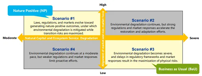 Prior to the risk assessment, we conducted a nature-related scenario analysis focusing on environmental conditions and market trends. The TNFD recommendations on Scenario Analysis recommends the use of a 2×2 matrix consisting of two axes: nature capital and ecosystem service degradation (x-axis) and the alignment of market and non-market forces (y-axis). This analysis comprehensively assessed the risk level and likelihood of potential future threats and evaluated the probability of risk occurrence and our financial strength for 25 identified business risks, based on the two defined scenarios: Scenario 1 (Nature Positive, or NP) and Scenario 3 (Business as Usual, or BaU).