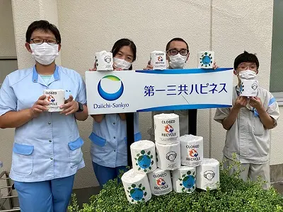Our special subsidiary Daiichi Sankyo Happiness’s Hiratsuka site conducts closed-loop recycling*2 as a contribution to a recycling-oriented society through employing disabled people. Collected documents and other materials are sorted into reusable paper only and recycled into toilet paper by a partner company, which is then used at the site where the documents and other materials are collected. We contribute to solving social issues by horizontally spreading the program to other sites and introducing it as a good practice in our environmental e-learning program for all employees.