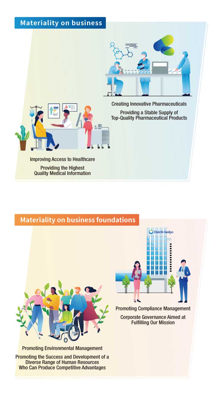 The word Materiality refers to critical issues that are particularly important for companies to continuously create value, and at Daiichi Sankyo we have determined eight categories of Materiality: four related to the business itself and four related to the business foundation.