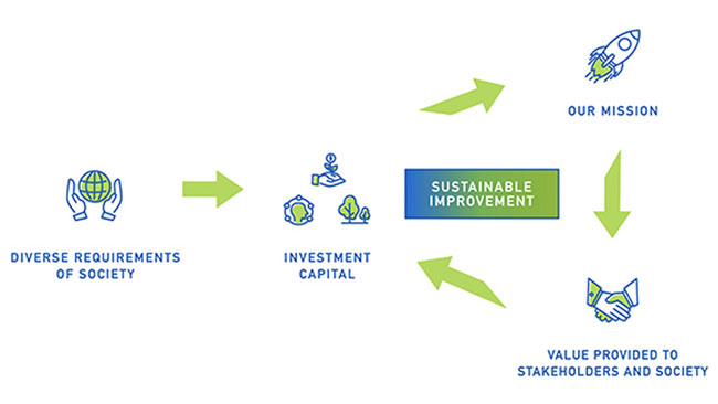 In the value creation process, our Daiichi Sankyo group of companies (the Daiichi Sankyo Group) invests the capital required to address various demands of society (for example, to fulfill unmet medical needs and to improve ESG-related issues), creates value that is worth several times what it has invested through its value chains, and returns the value to its stakeholders. It is a cycle where social capital is enriched, and enriched capital allows for further growth of the Daiichi Sankyo Group, leading to an increasingly affluent society.