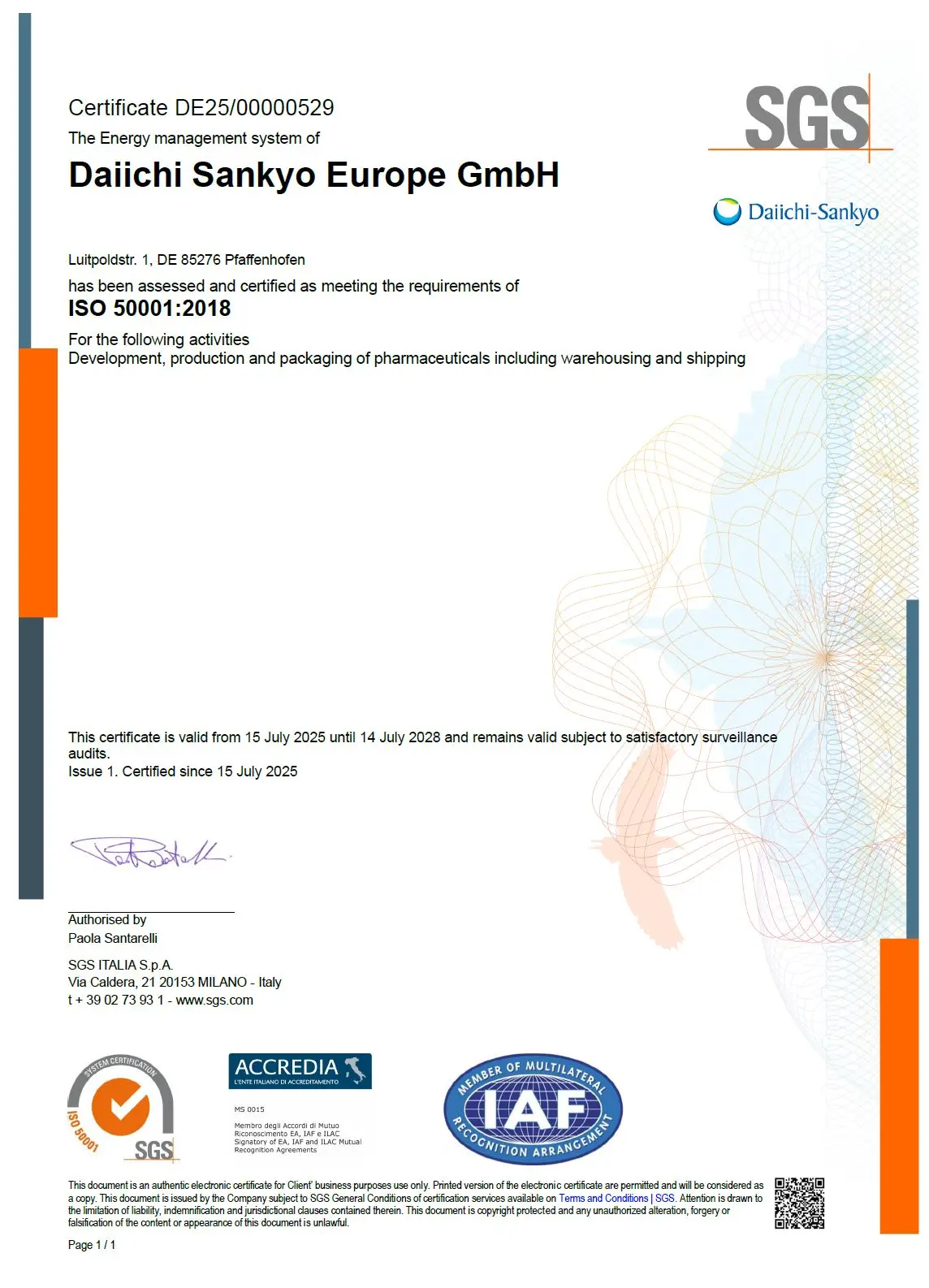 Daiichi Sankyo Europe’s manufacturing site in Pfaffenhofen, Germany, has achieved certification according to ISO 50001:2018, the international standard for energy management systems.