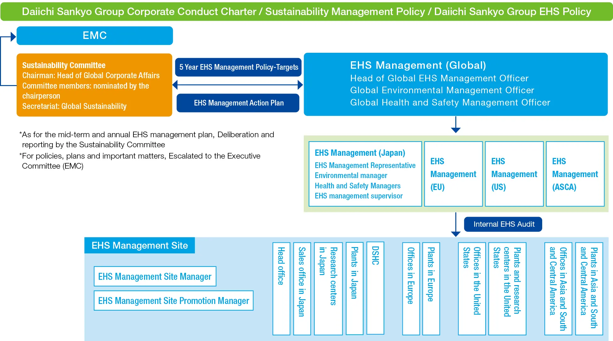 The Head of Global Corporate Affairs serves as the Head of Global EHS Management Officer, overseeing EHS management across the group, while the Head of Global Sustainability serves as the Global Environmental Management Officer and the Head of Global HR serves as the Global Health and Safety Management Officer, promoting EHS management. We have built appropriate EHS management systems that takes regional and unit structure considerations into account and establish EHS management sites as necessary while overseeing targets. The Sustainability Committee, chaired by the Head of Global Corporate Affairs, deliberates on policies, EHS Management Action Plan, and implementation reports regarding EHS management. The results of these discussions are escalated to the Executive Management Committee (EMC) and important issues are subsequently reported to the Board of Directors.
